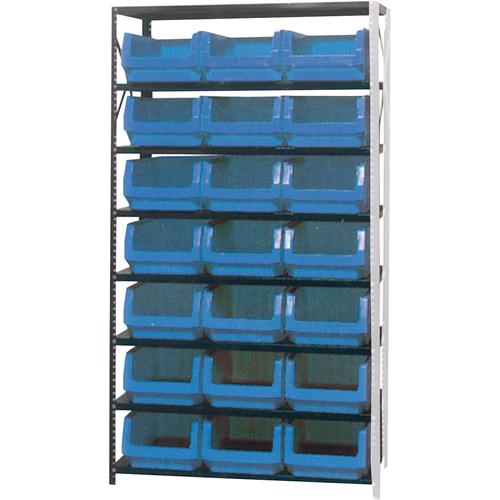 Shelving Unit with Stacking Bins – Add-On, 8, 650 lbs., Steel, 42″, 18″, 76″, Boltless, Open, 21, Blue, 12-3/8″ W x 19-3/4″ D x 7-7/8″ H, Grey Enamel