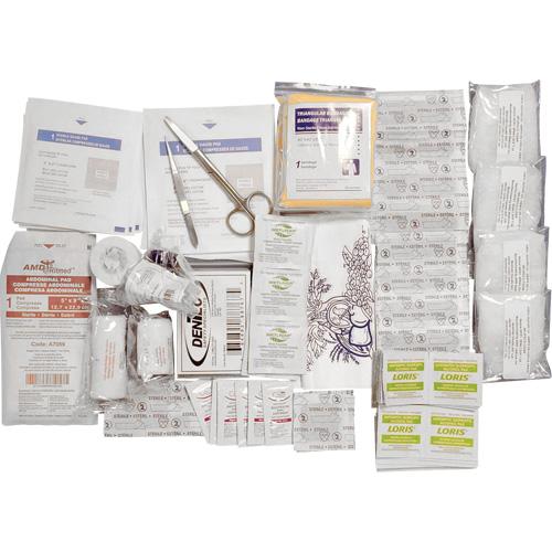 | Includes | Plastic Adhesive Strips 3/4 x3 (20); Rectangular Fabric Bandages 2" X 3" (1); Fabric Elastoband Fingertips (3); Elastoband Knuckles L/S singles (1); Gauze Pads Sterile 3" x 3" (12); Sterile Bandage Compress 4" X 4" (2); Alcohol Prep Pads (25); Hand cleansers (6); Adhesive Tape (Core) 2.5 cm x 4.5 m (1); Conform Bandage 2" x 5 yd (1); Vomitus Bag (1); Triangular Bandage 40" (2); Surgical Scissors 5-1/2" S/S (1); Splinter Forceps Fine Point 4-1/2" STRAIGHT (1); CPRO Shield With 1 way valve (1); Sterile Combine Pad / Abdominal Pad 5" x 9" (1); Bacitracin Zinc Ointment Single Dose 0.9G (6); Conform Bandage 3" (1); Rescue Sheets 56"x80" (1); Ziplock Bag 3"x4"x2mil (1); Pair of Vinyl Exam Gloves in Bag (4); Ziplock Bag 10" X 13" (1) |