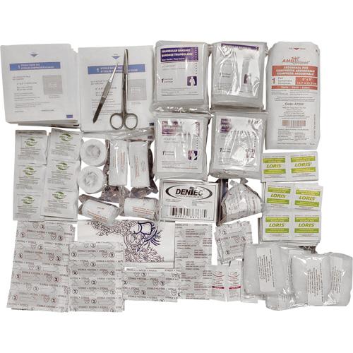| Includes | Plastic Adhesive Strips 3/4 x3 (90); Rectangular Fabric Bandages 2" X 3" (1); Fabric Elastoband Fingertips (8); Elastoband Knuckles L/S singles (1); Gauze Pads Sterile 3" x 3" (48); Sterile Bandage Compress 4" X 4" (8); Alcohol Prep Pads (100); Hand cleansers (24); Adhesive Tape (Core) 2.5 cm x 4.5 m (2); Conform Bandage 2" x 5 yd (4); Vomitus Bag (2); Triangular Bandage 40" (8); Surgical Scissors 5-1/2" S/S (1); Splinter Forceps Fine Point 4-1/2" STRAIGHT (1); CPRO Shield With 1 way valve (1); Sterile Combine Pad / Abdominal Pad 5" x 9" (2); Bacitracin Zinc Ointment Single Dose 0.9G (24); Conform Bandage 3" (4); Rescue Sheets 56"x80" (1); Ziplock Bag 4"x6" (1); Pair of Vinyl Exam Gloves in Bag (16); Ziplock Bag 15" X 20" X 2 MIL (1) |
