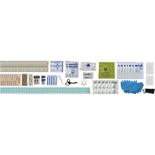| Includes | (40) Plastic Adhesive Strips (3/4 x 3); (1) Fabric Bandages Rectangular 2" X 3"; (8) Fabric Elastoband Fingertips; (1) Elastoband Knuckles L/S singles; (24) Gauze Pads Sterile 3" x 3"; (4) Bandage Compress Sterile 10CM X 10CM (4" X 4"); (50) Alcohol Prep Pads; (1) Adhesive Tape (core) 2.5 cm x 4.5 m; (2) Biohazard Disposal Bag; (4) Triangular Bandage 40"; (1) Splinter Forcepts Fine Point 4-1/2" Straight; (1) CPRO Shield With 1way valve; (2) Combine Pad/ Abdominal Pad Sterile 5" x 9"; (1) Label; Poly Clear 16/24U; (2) Conform Bandage 3"; (1) Rescue Sheet / Emergency Blanket 52" x 84"; (1) Ziplock Bag 3" x 4" x 2 mil; (8) Large Nitrile Gloves Powder Free; (2) Bandage conform 2" x 5 yd (50 mm x 4.5 m); (1) Bandage Scissors 5 1/2 SS Curved Blunt Nose; (1) 24 Unit Polyprop Box only 9.5 x 9.5 x 3; (1) Bag Ziplock 5" X 8"; (1) Combat Application Tourniquet; (12) Paws Personal Antimicrobial Wipe |
