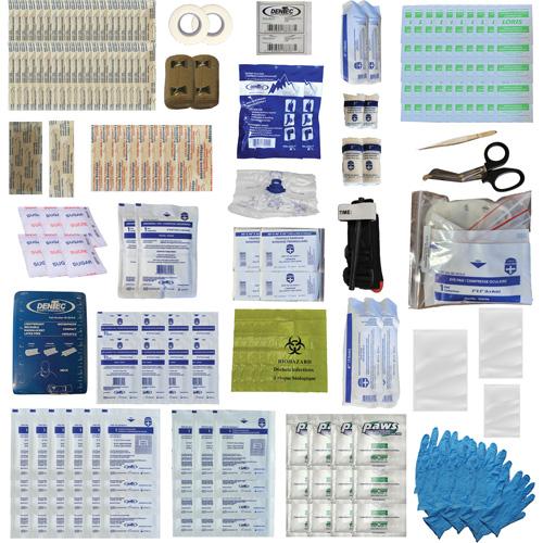 | Includes | (40) Plastic Adhesive Strips (3/4 x 3); (1) Fabric Bandages Rectangular 2" X 3"; (8) Fabric Elastoband Fingertips; (1) Elastoband Knuckles L/S singles; (24) Gauze Pads Sterile 3" x 3"; (12) Gauze Pads Sterilized 4" x 4"; (2) Bandage Compress Sterile 10CM X 10CM (4" X 4"); (50) Alcohol Prep Pads; (2) Adhesive Tape (core) 2.5 cm x 4.5 m; (2) Conform Bandage 3"; (4) Biohazard Disposal Bag; (8) Non-Adherent Pad Sterile 5CM X 7.5CM (2" X 3"); (4) Combine Pad/ Abdominal Pad Sterile 5" x 9"; (4) Triangular Bandage 40"; (1) Splinter Forcepts Fine Point 4-1/2" Straight; (1) CPRO Shield With 1way valve; (2) Elastic Reinforced 3" X 5 YDS (7.5cm x 4.5m); (2) Rescue Sheet / Emergency Blanket 52" x 84"; (2) Instant Cold Pack (4" x 6"); (1) Waterproof Bag Ziplock 10" X 13"; (1) Ziplock Bag 4" x 6"; (1) Ziplock Bag 3" x 4" x 2 mil; (2) Bandage Compress; Sterile 15CM X 15CM (6" X 6"); (1) Eye Packet #2; (8) Large Nitrile Gloves Powder Free; (2) Bandage conform 2" x 5 yd (50 mm x 4.5 m); (1) Bandage Scissors 5 1/2 SS Curved Blunt Nose; (1) Bag Ziplock 15" X 20" 2 mil; (1) Bag Ziplock 5" X 8"; (1) Foam Splint Aluminum 24 inch x 4 inch 4 Fold Blue and White; (1) Combat Application Tourniquet; (6) Individual Package of Sugar; (12) Paws Personal Antimicrobial Wipe; (1) Label; Poly Clear 36U; (1) Nylon Soft Pack First Aid Bag #2 Medium |