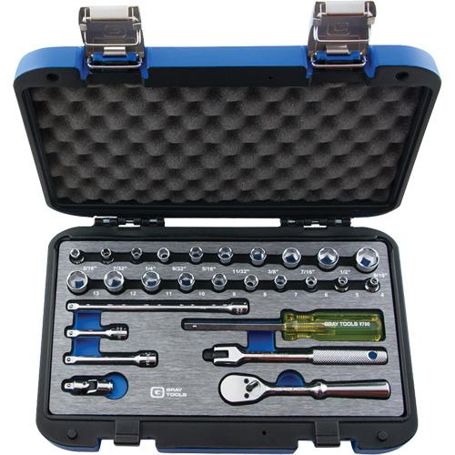 - Includes: 4 mm, 5 mm, 6 mm, 7 mm, 8 mm, 9 mm, 10 mm, 11 mm, 12 mm, 13 mm, 3/16", 7/32", 1/4", 9/32", 5/16", 11/32", 3/8", 7/16", 1/2", 9/16" sockets, 20 Tooth Ratchet, Flex Handle , 2", 3" & 6" Extensions, U-Joint and Hand Driver