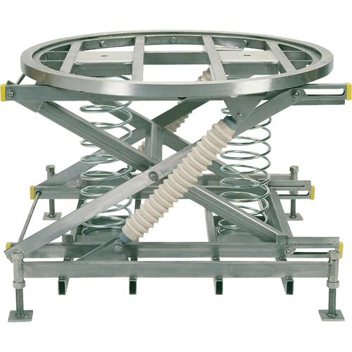 - Speeds loading and unloading of pallets, reduces the danger of fatigue and injury. This lifter is a rugged turntable-equipped platform which lowers and raises the load as weight is applied or removed so that loading/unloading can be done at a convenient height. Reduces time and effort required to load or unload pallets. Load height adjusts automatically, eliminating the needs for controls or operator involvement. Heavy-duty springs are calibrated to bring pallets to the most convenient working height. Built-in fork pockets allow for relocation by fork truck and increase stability. Travel height ranges from 9 1/2" to 28". Designed to handle loads up to 4500 lbs. 43 5/8" diameter rotating ring, 45 1/4" L x 43 5/8" W frame. Available in various spring combinations, in powder coated steel or stainless steel construction.; ; Note: Springs are precisely calibrated and will work properly only within the load weight and height ranges selected. Selection based on higher or lower than actual weight will result in restricted travel capabilities. Should requirements change, lifter can be adapted in the field by simply changing spring combination