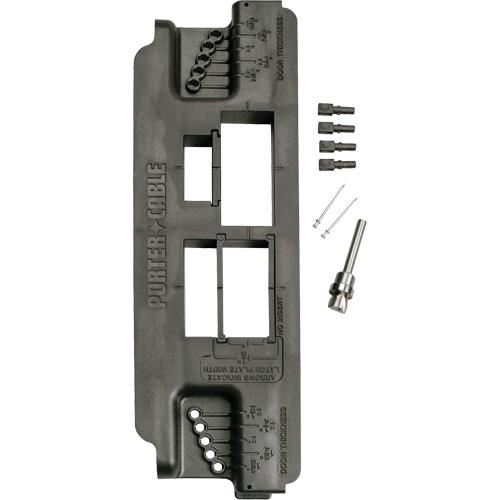 - Includes: (1) Strike and latch template with 3 insert pieces, (4) Positive placement lock-in pins (2 spares), (2) Double-headed nails, (1) High-speed steel bearing guided bit, (1) Instruction sheet