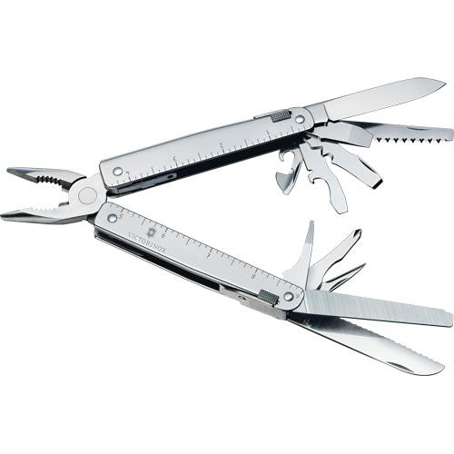 - Features include needle-nosed pliers, wire cutter for thin and soft wire up to 40 HRC, hard wire cutter, large blade, large blade with wavy edge, wood saw, metal saw, metal file, reamer/punch, can opener, 3mm screwdriver, bottle opener, 5.5 mm screwdriver, wire bender, 1/2" Phillips screwdriver, 2 mm screwdriver, 8 mm screwdriver, strong crate opener, 7mm chisel, wire stripper, wire scraper, ruler (in.), lanyard hole, ruler (cm.)
