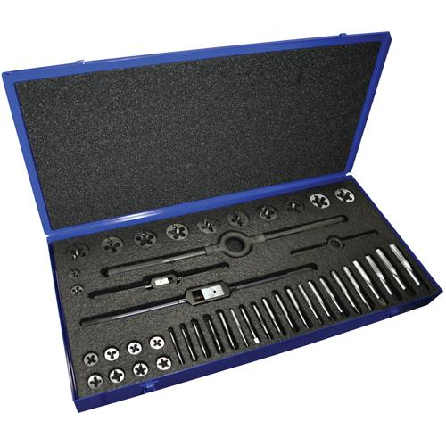 | Includes | 1/4-20 NC Tap; 1/4-28 NF Tap; 5/16-18 NC Tap; 5/16-24 NF Tap; 3/8-16 NC Tap; 3/8-24 NF Tap; 7/16-14 NC Tap; 7/16-20 NF Tap; 1/2-13 NC Tap; 1/2-20 NF Tap; 9/16-12 NC Tap; 9/16-18 NF Tap; 5/8-11 NC Tap; 5/8-18 NF Tap; 3/4-10 NC Tap; 3/4-16 NF Tap; 7/8-9 NC Tap; 7/8-14 NF Tap; 1-8 NC Tap; 1-12 NF Tap; 1/4-20 NC Die; 1/4-28 NF Die; 5/16-18 NC Die; 5/16-24 NF Die; 3/8-16 NC Die; 3/8-24 NF Die; 7/16-14 NC Die; 7/16-20 NF Die; 1/2-13 NC Die; 1/2-20 NF Die; 9/16-12 NC Die; 9/16-18 NF Die; 5/8-11 NC Die; 5/8-18 NF Die; 3/4-10 NC Die; 3/4-16 NF Die; 7/8-9 NC Die; 7/8-14 NF Die; 1-8 NC Die; 1-12 NF Die; #5 Tap Wrench; #7 Tap Wrench; #6 Die Stock; #1852 Die Stock |