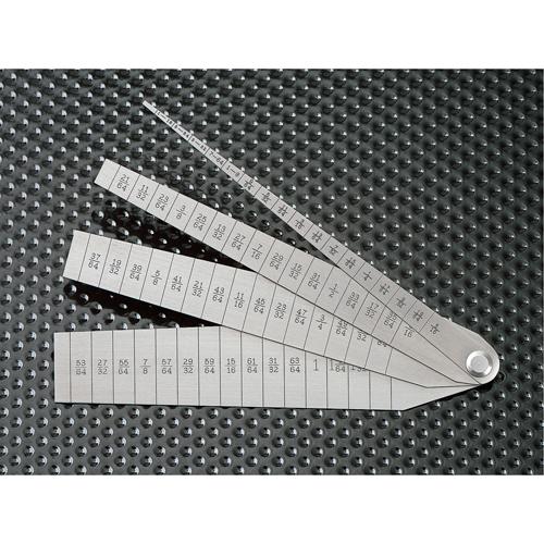 Specially designed for rapid, accurate checking of inside diameters of tubing.; Thin, tapered leaves graduated to measure inside diameters or widths from 1/160 to 1 1/160 in 64ths of an inch.
