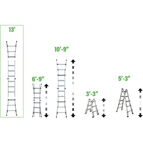 - Works as an extension ladder, step ladder, stairway ladder, and 90° wall ladder