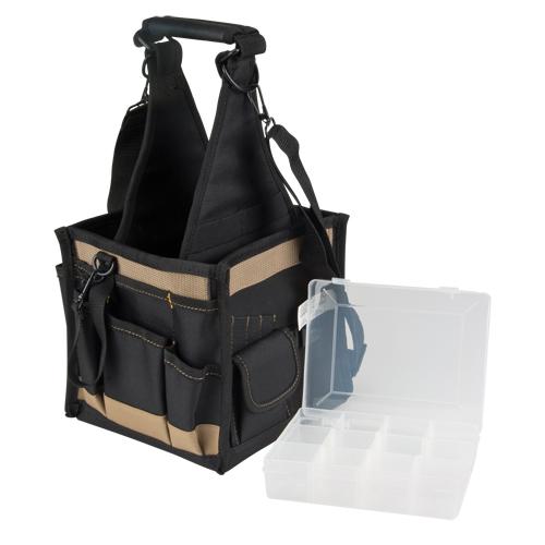- 7" x 5 1/2" multi-compartment plastic tray included, slides securely into bottom of pouch
