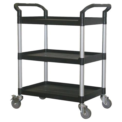 - Aluminum posts and composite material shelves make for a lightweight cart that's easy to maneuver