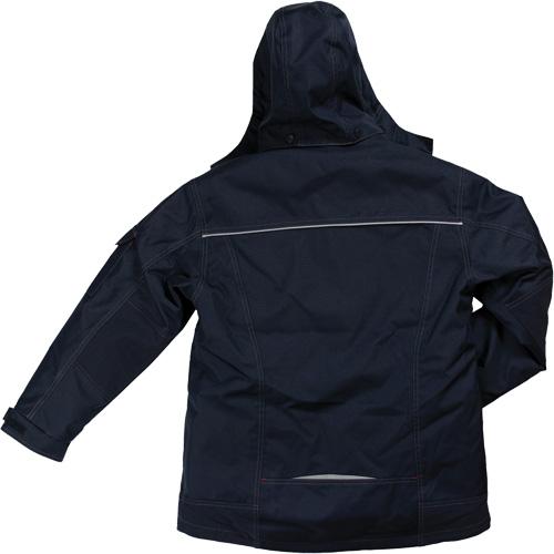 - Outer shell features full zip front closure, double storm placket with hook and loop closure, detachable hood with adjustable drawcord, upper welt pocket with flap and reflective trim, upper zipper pocket, two lower welt pockets, adjustable drawcord at hem, adjustable cuffs with hook and loop closure, drop back, contrast stitching detail, reflective enhancements, seam sealed, lining pockets, embroidery access zipper