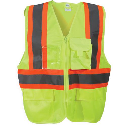 - This 100% polyester vest with zipper front has 2 bottom pockets, a breast pocket and a clear ID pocket